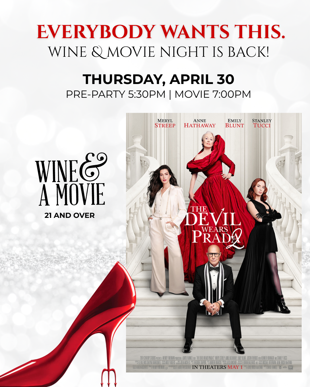 The wine reception starts at 5:30, followed by the movie at 7:00. Ticket price includes movie ticket, commemorative wine glass and first glass of wine. Additional wine is available for purchase. Other fun surprises to be announced.